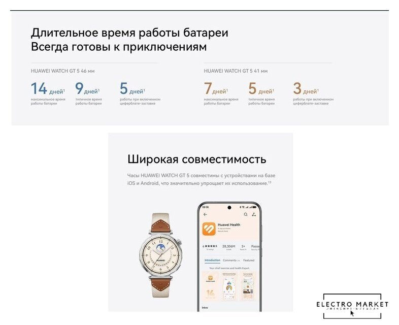 Режимы работы | 7 дней — максимальное время работы батареи5 дней — стандартное время работы батареи3 дня работы при включенной функции экрана-заставкиБатарея может работать 7 дней без подзарядки при следующих условиях:применены настройки по умолчанию, 30 минут в режиме вызовов по Bluetooth в неделю, 30 минут в режиме воспроизведения музыки в неделю, мониторинг пульса всегда включен, функция мониторинга сна включена ночью, 90 минут в режиме тренировок в неделю, уведомления включены (50 SMS-сообщений, 6 вызовов и 3 будильника в день), включение экрана 200 раз в день. Фактическое время работы батареи может отличаться в зависимости от особенностей использования устройства.Батарея может работать 5 дней без подзарядки при следующих условиях:применены настройки по умолчанию, 30 минут в режиме вызовов по Bluetooth в неделю, 30 минут в режиме воспроизведения музыки в неделю, мониторинг пульса всегда включен, функция мониторинга сна включена ночью, мониторинг уровня стресса включен, 180 минут в режиме тренировок в неделю, уведомления включены (50 SMS-сообщений, 6 вызовов и 3 будильника в день), общее время работы с включенным экраном в день составляет 30 минут. Фактическое время работы батареи может отличаться в зависимости от особенностей использования устройства.Батарея может работать 3 дня без подзарядки при следующих условиях:применены настройки по умолчанию, включен циферблат-заставка, 30 минут в режиме вызовов по Bluetooth в неделю, 30 минут в режиме воспроизведения музыки в неделю, мониторинг пульса всегда включен, функция мониторинга сна включена ночью, мониторинг уровня стресса включен, 180 минут в режиме тренировок в неделю, уведомления включены (50 SMS-сообщений, 6 вызовов и 3 будильника в день), общее время работы с включенным экраном в день составляет 30 минут. Фактическое время работы батареи может отличаться в зависимости от особенностей использования устройства. |