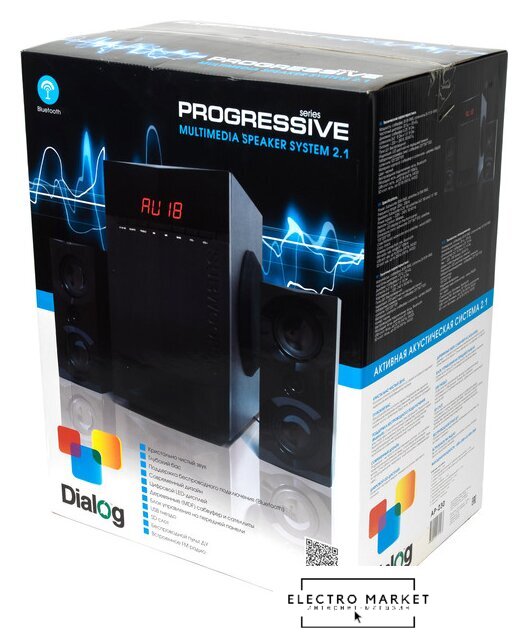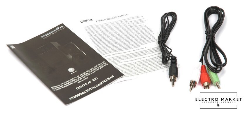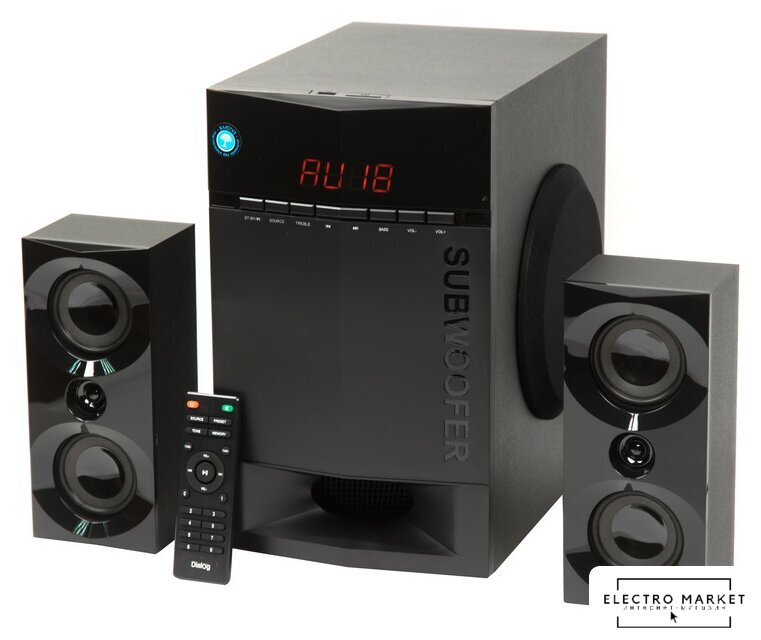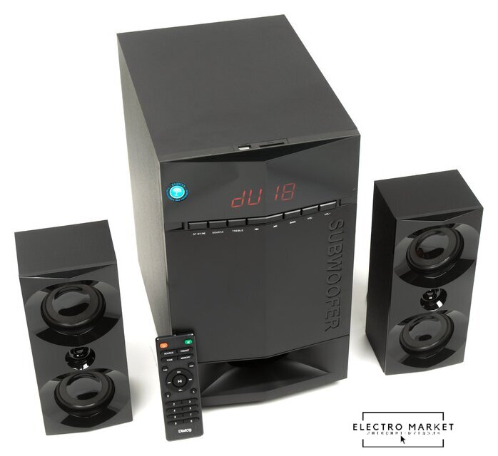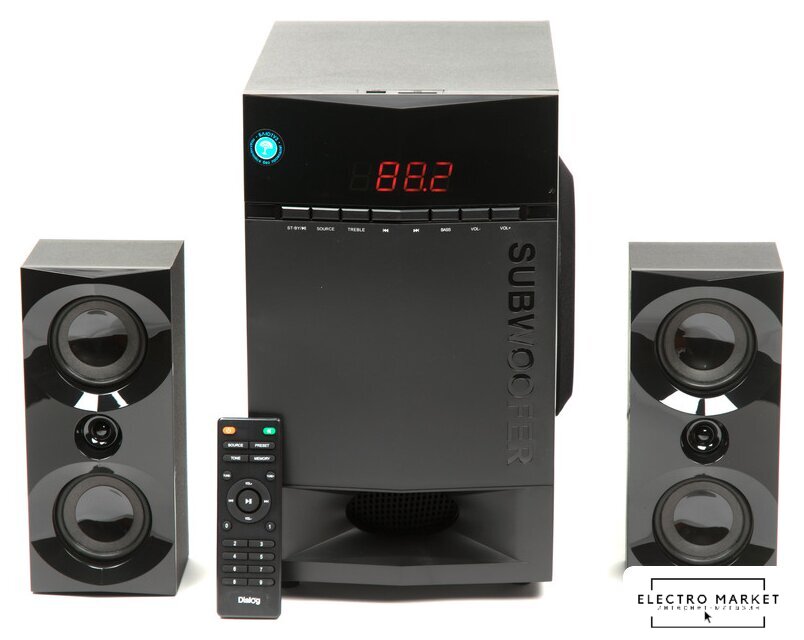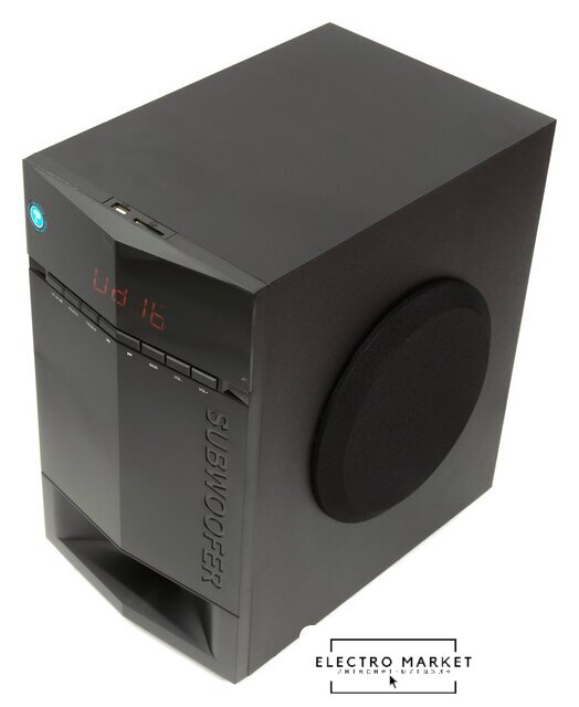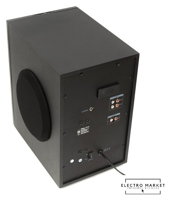 Комплект поставки | сабвуфер, два сателлита с кабелем для подключения, кабель для подключения к источнику сигнала 2RCA-M->3.5 мм "стерео джек", пульт дистанционного управления, руководство пользователя, гарантийный талон, упаковка |