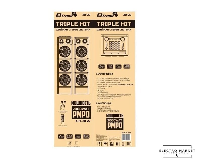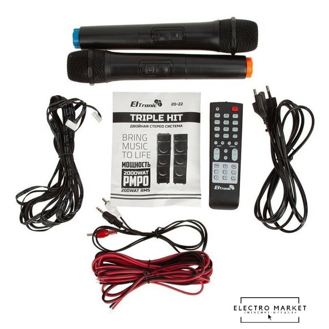 | Комплект поставки | - пульт ДУ- два ручных радиомикрофона- кабель подсветки- аудиокабель для проводной коммутации колонок- аудиокабель RCA- кабель питания- документация |