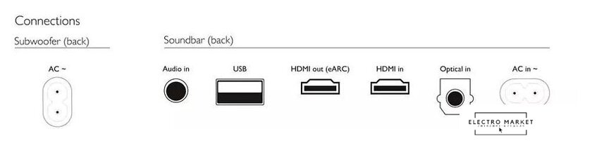 | Комплект поставки | - звуковая панель- беспроводной сабвуфер- пульт ДУ- батарейки для пульта ДУ- кабель питания- набор для настенного крепежа- документация |