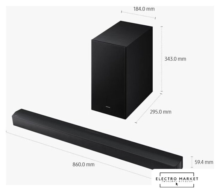 | Комплект поставки | - звуковая панель- беспроводной сабвуфер- пульт ДУ- батарейки для пульта ДУ- кабель питания (2 шт.)- оптический кабель- набор для настенного крепежа- документация |