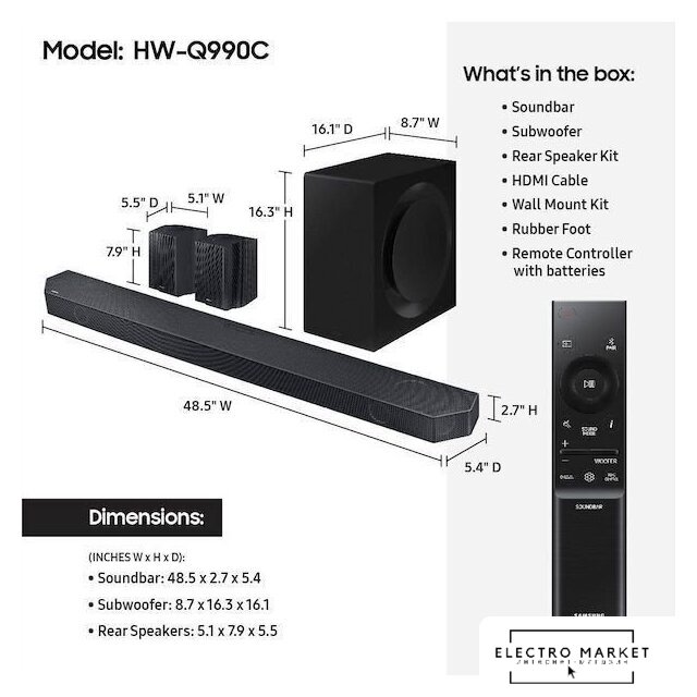 | Комплект поставки | - звуковая панель- беспроводной сабвуфер- тыловые колонки- пульт ДУ- батарейки для пульта ДУ- кабель питания (4 шт.)- кабель HDMI- набор для настенного крепежа- документация |