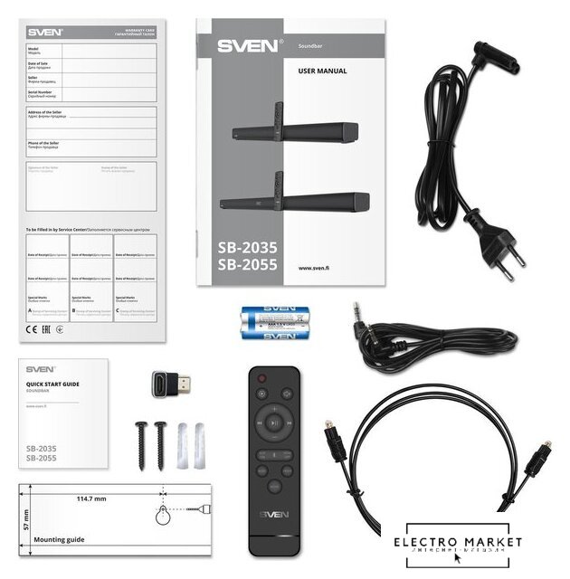 | Комплект поставки | - пульт ДУ- батарейки для пульта ДУ (2xAAA)- оптический аудиокабель- аудиокабель 3.5 мм- адаптер HDMI угловой - адаптер питания- набор для настенного крепежа- документация |