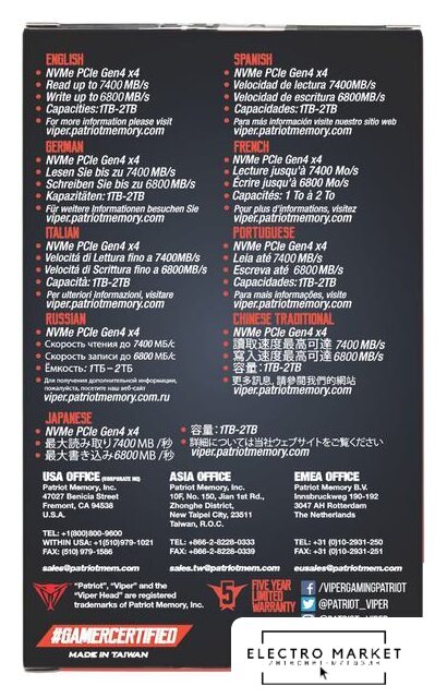 1 ТБ, M.2 2280, PCI Express 4.0 x4, контроллер Phison PS5019-E19T, последовательный доступ: 3600/2830 МБайт/с, случайный доступ: 525000/640000 IOps