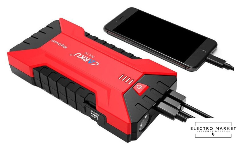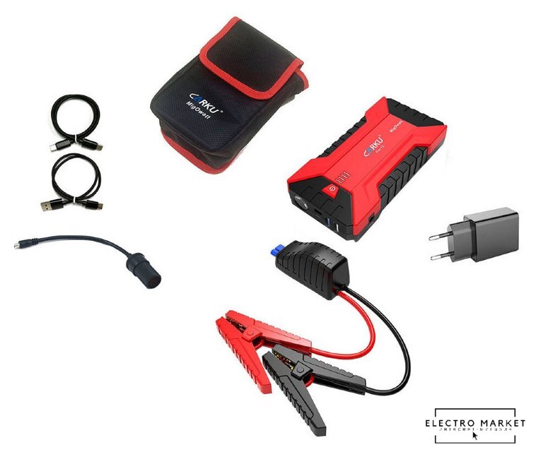 | Комплект поставки | – Устройство CARKU PRO-10;– Сетевой адаптер для зарядки устройства от 220В;– Интеллектуальные пусковые провода с зажимами для подключения к автоаккумулятору;– Адаптер автоприкуривателя типа «мама» для подключения приборов 12В;– Кабель USB / USB Type-C;– Кабель USB Type-C / USB Type-C;– Инструкция по эксплуатации на русском языке;– Сумка для переноски и хранения комплекта. |