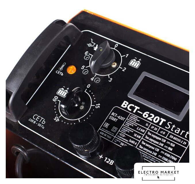 ёмкость заряжаемой батареи: 50–800 А·ч, ток зарядки: 15–50 А, максимальный пусковой ток: 360 А, масса: 23 кг
