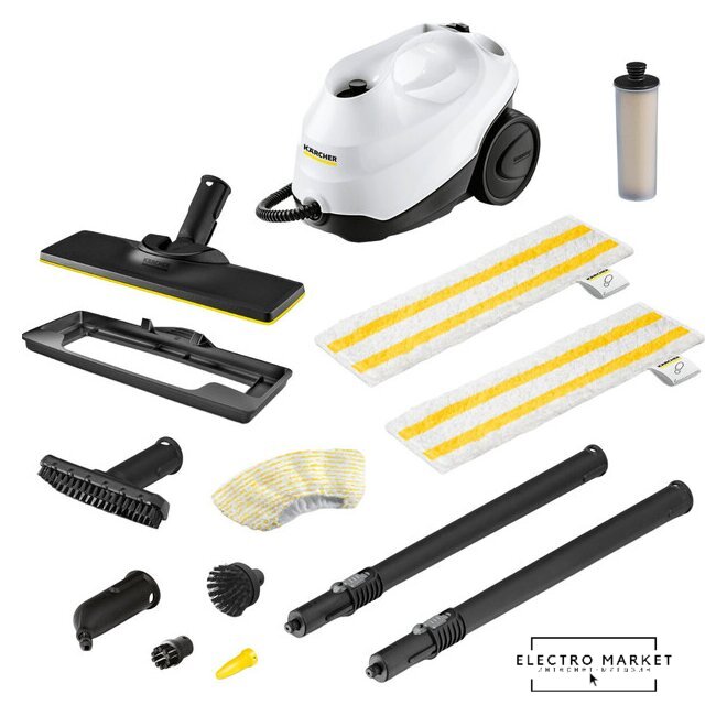 Дополнительные насадки и приспособления | Универсальная салфетка для пола EasyFix: 2 шт.Микроволоконная обтяжка для ручной насадки: 1 шт.Картридж для защиты от накипи.Точечное сопло.Ручная насадка.Мощное сопло.Малая круглая щетка (черная): 1 шт.Большая круглая щетка.Насадка для пола: EasyFix.Удлинительные трубки (2 × 0,5 м).Накладка для освежения ковров. |