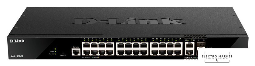 | Комплектация | • Коммутатор DGS-1520-28• Кабель питания• Фиксатор для кабеля питания• Консольный кабель (с разъемами RJ-45 и RS-232)• 2 крепежных кронштейна для установки в 19-дюймовую стойку• 4 резиновые ножки• Комплект для монтажа• Краткое руководство по установке |