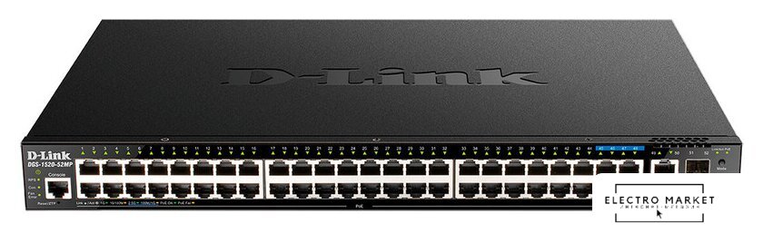| Комплектация | • Коммутатор DGS-1520-52MP• Кабель питания• Фиксатор для кабеля питания• Консольный кабель (с разъемами RJ-45 и RS-232)• 2 крепежных кронштейна для установки в 19-дюймовую стойку• 4 резиновые ножки• Комплект для монтажа• Краткое руководство по установке |