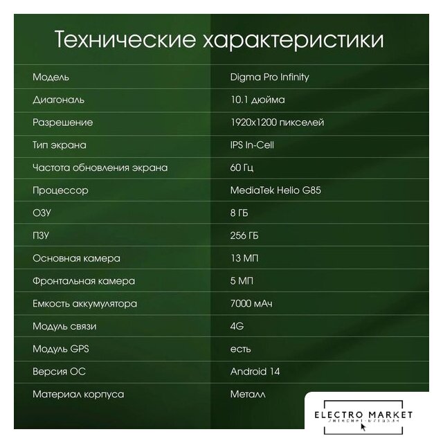 10.36" IPS, 60 Гц (2000x1200), Android, UniSoC Tiger T616, 8 ГБ / 128 ГБ, Wi-Fi + сотовая связь, аккумулятор 7500 мАч