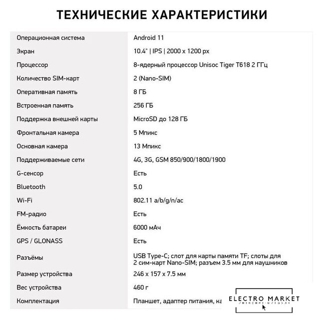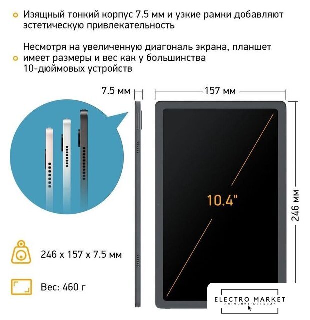 8.7" TN+Film, 90 Гц (1340x800), Android, Mediatek Helio G99, 4 ГБ / 64 ГБ, Wi-Fi + сотовая связь (nanoSIM), аккумулятор 5100 мАч