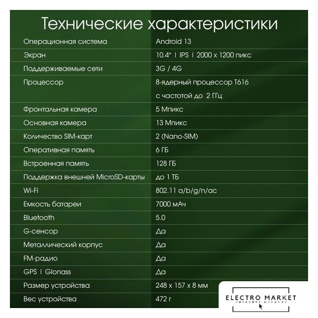 10.1" IPS, 60 Гц (1280x800), Android, Spreadtrum SC9863A1, 3 ГБ / 32 ГБ, Wi-Fi + сотовая связь (nanoSIM + nanoSIM), аккумулятор 6000 мАч