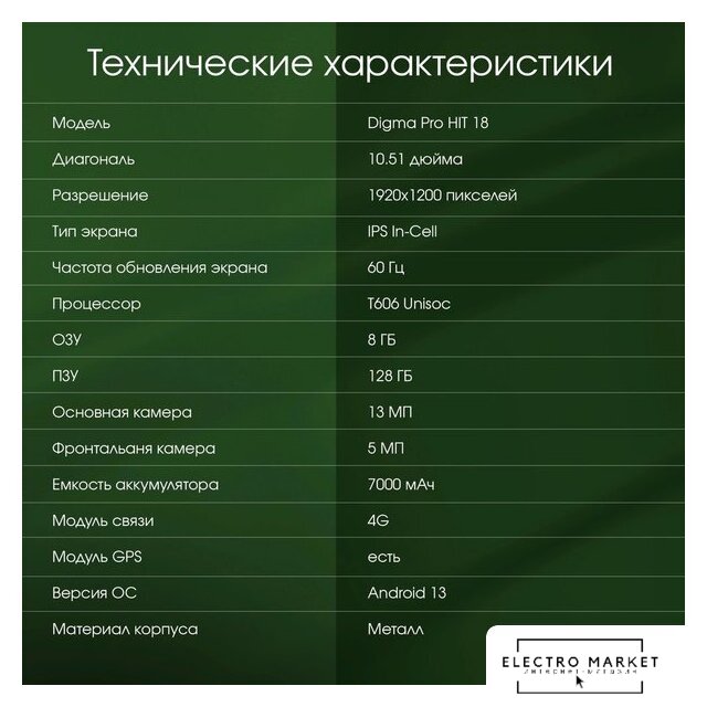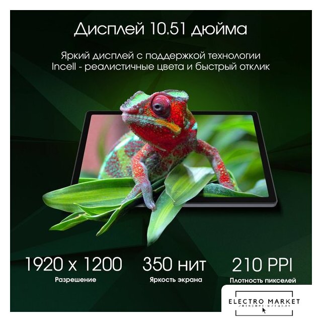 11.0" IPS, 60 Гц (1920x1200), Android, UniSoC Tiger T606, 6 ГБ / 128 ГБ, Wi-Fi + сотовая связь, аккумулятор 8000 мАч