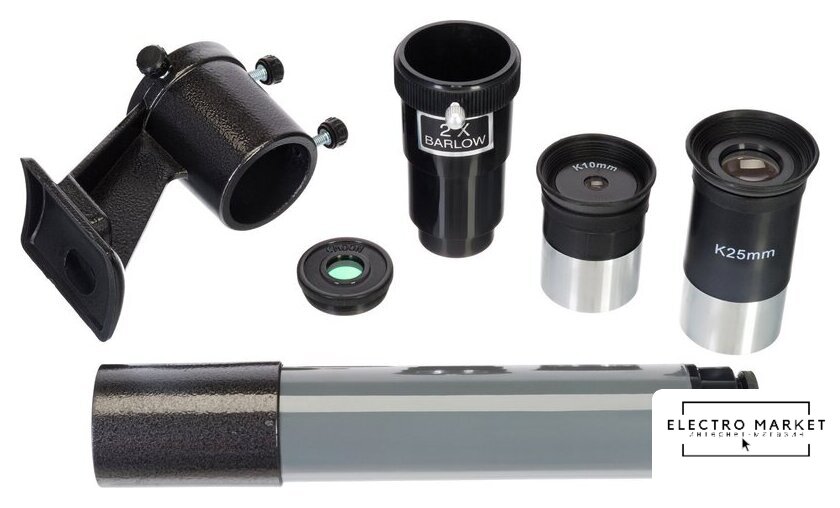 ахроматический рефрактор, диаметр: 70 мм, фокусное расстояние: 900 мм, относительное отверстие: 1/12.9, экваториальная (EQ) монтировка, окуляры 10 мм/25 мм