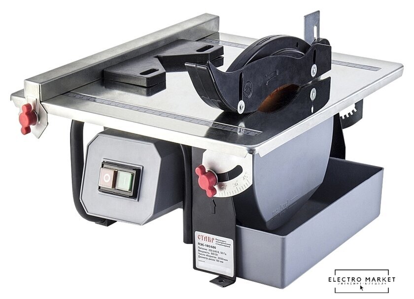 Комплектация | диск отрезной, ключ 2 шт., защитный кожух, лоток для воды, параллельный упор, угловой упор, расклинивающий нож с креплением |