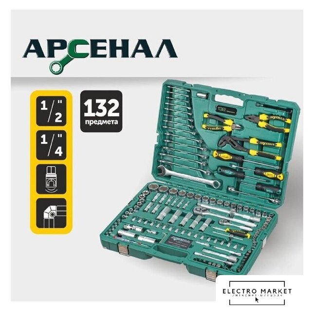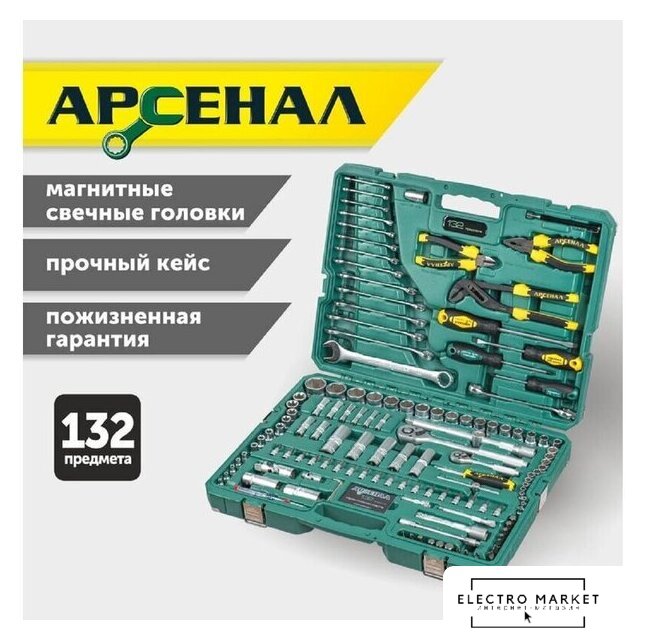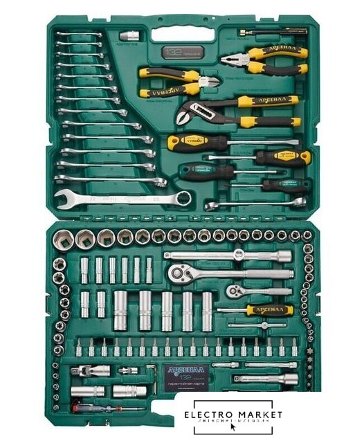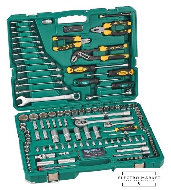 | Комплектация | Головки 1/4:, 6-гранные: 4; 4.5; 5; 5.5; 6; 7; 8; 9; 10; 11; 12; 13; 14 (мм);, 6-гранные глубокие: 6; 7; 8; 9; 10; 11; 12; 13 (мм);, Torx Е-стандарт: E4; E5; E6; E7; E8;, Головки 1/2:, 6-гранные: 10; 11; 12; 13; 14; 15; 16; 17; 18; 19; 20; 21; 22, 24; 27; 30; 32 (мм);, 6-гранные глубокие: 14; 15; 17; 19; 22 (мм);, Torx Е-стандарт: E10; E11; E12; E14; E16; E18; E20; E22;, Свечные магнитные: 16; 21 (мм);, Приводы 1/4:, Трещотка 72 зуба;, Вороток Т-образный скользящий 115мм;, Удлинители шаровые(wobble): 50; 100 (мм);, Удлинитель гибкий 150мм;, Шарнир карданный;, Приводы 1/2:, Трещотка 72 зуба;, Удлинители шаровые(wobble): 125; 250 (мм);, Адаптер скользящий для удлинителей: 1/2(П) на 3/8(М);, Шарнир карданный;, Ключи:, Ключи комбинированные: 6; 7; 8; 9; 10; 11; 12; 13; 14; 15; 16; 17; 19; 22 (мм);, Ключ разрезной 17*19мм;, Шестигранные: 1.5; 2; 2.5 (мм);, Биты:, Биты-вставки на 1/4:, Sl: 4; 5.5; 6.5 (мм);, Ph: 1; 2;, Pz: 1; 2;, Hex: 3; 4; 5; 6 (мм);, Torx (T): 8; 10; 15; 20; 25; 27; 30;, Биты на 5/16:, Sl: 8; 10; 12 (мм);, Ph: 3; 4;, Pz: 3; 4;, Hex: 8; 10; 12; 14 (мм);, Torx (T): 40; 45; 50; 55; 60;, Адаптер для бит (с 1/2 на 5/16);, Отвертки:, Sl: 6.5*100; 8*150 (мм);, Ph: 1*75; 2*100 (мм);, Рукоятка отверточная на 1/4;, Шарнирно-губцевый инструмент:, Пассатижи 150мм;, Бокорезы 150мм;, Клещи переставные 240мм;, Специализированный инструмент:, Магнит телескопический;, Автотестер 6-12-24в;, Крокодилы. |