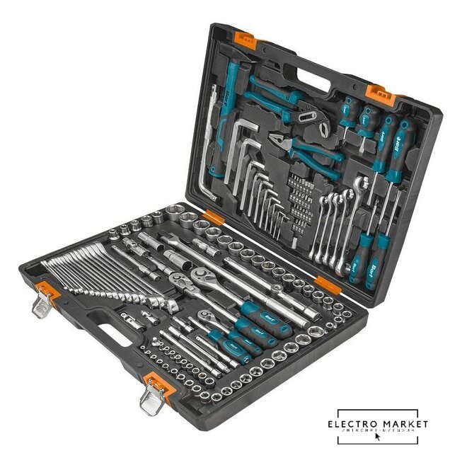 | Комплектация | Биты 25 мм (26 шт) Головки 1/4" (9 шт) Головки 1/2" Е-профиль (5 шт) Рукоятка с трещеткой квадрат 1/4 (1 шт) Рукоятка для головок (1 шт) Удлинитель 1/4":50 мм (1 шт) Удлинитель 1/4":100 мм (1 шт) Удлинитель 1/4":150мм (1 шт) Гибкий удлинитель (1 шт) Шарнир карданный 1/4 (1 шт) Головки 3/8" (15 шт) Рукоятка с трещеткой квадрат 3/8 (1 шт) Удлинитель 3/8 75 мм (1 шт) Удлинитель 3/8 250 мм (1 шт) Шарнир карданный 3/8” (1 шт) Головки 1/2" (19 шт) Головки 1/2" Е-профиль (5 шт) Головка торцевая свечная, 1/2" (2 шт) Шарнирный кардан 1/2" (1 шт) Вороток Г-образный 1/2" 250 мм (1 шт) Вороток шарнирный 1/2 430 мм (1 шт) Удлинитель 1/2":75 мм (1 шт) Удлинитель 1/2":150 мм (1 шт) Рукоятка с трещеткой квадрат 1/2 (1 шт) Переходник 3/8"–1/2" (1 шт) Переходник 3/8"–1/4" (1 шт) Держатель для бит (1 шт) Ключ имбусовый (10 шт) Ключ накидной (5 шт) Ключ комбинированный (17 шт) Отвертка (6 шт) Пассатижи (1 шт) Ключ трубный (1 шт) Молоток (1 шт) |