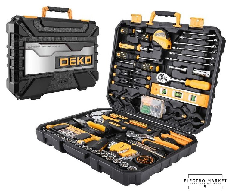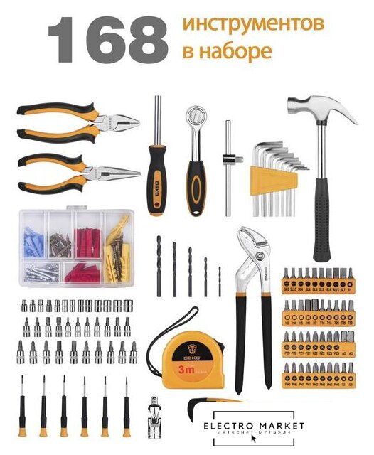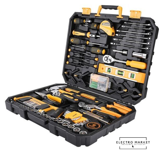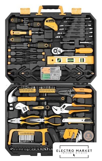 | Комплектация | - Рулетка 3 м;- Отвертка для бит с трещоткой 6.35 мм;- Отвертки PH2Х38, 2Х100 мм., SL 6х38, 6х100 мм;- Отвертки точечные PH0, 00, 000; SL 2.4, 3 мм;- Зажим нейлоновый 3";- Комбинированные ключи 8, 10, 12, 13, 14, 15 мм;- Уровень 25 мм;- Трещотка 3/8";- Удлинитель торцевых головок 3/8"х3";- Головки свечные 3/8"х16 мм;- Головки 1/4": 4, 4.5, 5, 5.5, 6, 7, 8, 9, 10, 1, 12, 13 мм; 3/8": 10, 11, 12, 13, 14, 15, 16, 17, 18, 19 мм;- Переходник для головок торцевых: 1/4"х3/8";- Биты SL3, 4, 5, 6, 7; PH0, 1, 2, 3; PZ1, 2; Т10, 15, 20, 25, 30; S1, 2, 3; AD;- Биты 1/4" 15 мм: SL4, 5, 6; PH0, 1, 2, 3; T15, 20; AD;- Разводной ключ 8";- Разводной ключ 45 градусов 8";- Пассатижи 6";- Длинногубцы 6";- Молоток 0.2 кг;- Инструмент для зачистки проводов 7";- Пила 6";- Сменные полотна для пилы 2 шт;- Хомуты пластиковые 5 шт;- Ключи шестигранные: 1.5, 2, 2.5, 3, 4, 5, 6, 8, 10 мм;- Нож строительный 18 мм;- Изоляционная лента 5 м;- Шестигранный адаптер 60 мм;- Набор дюбелей и саморезов 71 шт. |