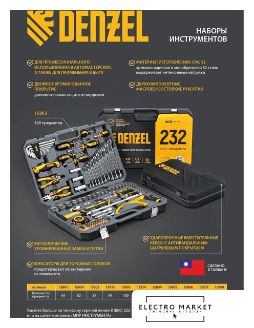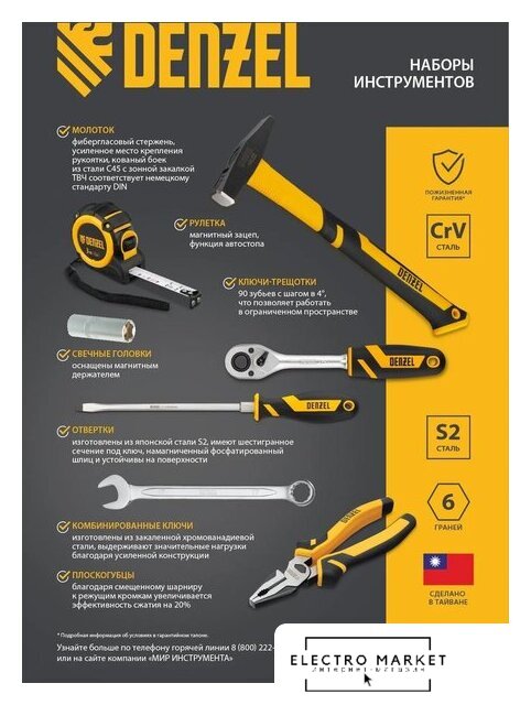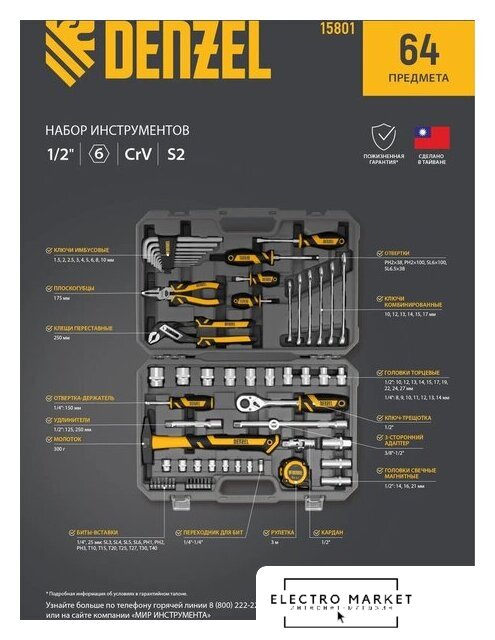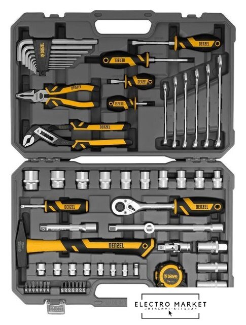 | Комплектация | Ключ-трещотка 1/2", 1/4"2 штУдлинители 1/2"2 шт3-сторонний адаптер 3/8"-1/2"1 штПереходник для бит 1/4"-1/4"1 штКардан 1/2"1 штРулетка 3 м1 штПлоскогубцы 175 мм1 штКлещи преставные 250 мм1 штМолоток 2К-рукоятка: 300г1 штОтвертка-держатель 2К-рукоятка 1/4": 150 мм1 штОтвертки с шестигранным сечением и выступом под ключ4 штГоловки торцевые 1/2"10 штГоловки торцевые 1/4"7 штКлючи комбинированные6 штГоловки свечные магнитные 1/2"3 штКлючи имбусовые9 штБиты-вставки 1/4", 25мм14 штПластиковый кейс1 шт |