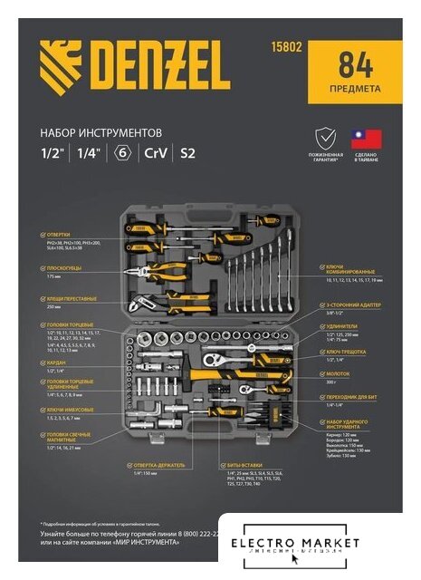 | Комплектация | Ключ-трещотка 1/2", 1/4"2 штУдлинители 1/2"2 штУдлинитель 1/4"1 штКардан2 шт3-сторонний адаптер 3/8"-1/2"1 штПереходник для бит 1/4"-1/4"1 штПлоскогубцы: 175 мм1 штКлещи преставные: 250 мм1 штМолоток 2К-рукоятка: 300г1 штКернер: 120 мм1 штБородок: 120 мм1 штКрейцмейсель: 130 мм1 штЗубило: 130 мм1 штВыколотка: 150 мм1 штОтвертка-держатель 1/4": 150 мм1 штОтвертки с шестигранным сечением и выступом под ключ5 штКлючи имбусовые6 штКлючи комбинированные8 штГоловки торцевые 1/2"13 штГоловки торцевые 1/4"12 штГоловки торцевые удлиненные 1/4"5 штГоловки свечные магнитные 1/2"3 штБиты-вставки 1/4", 25 мм14 штПластиковый кейс1 шт |