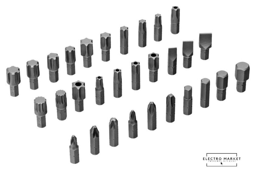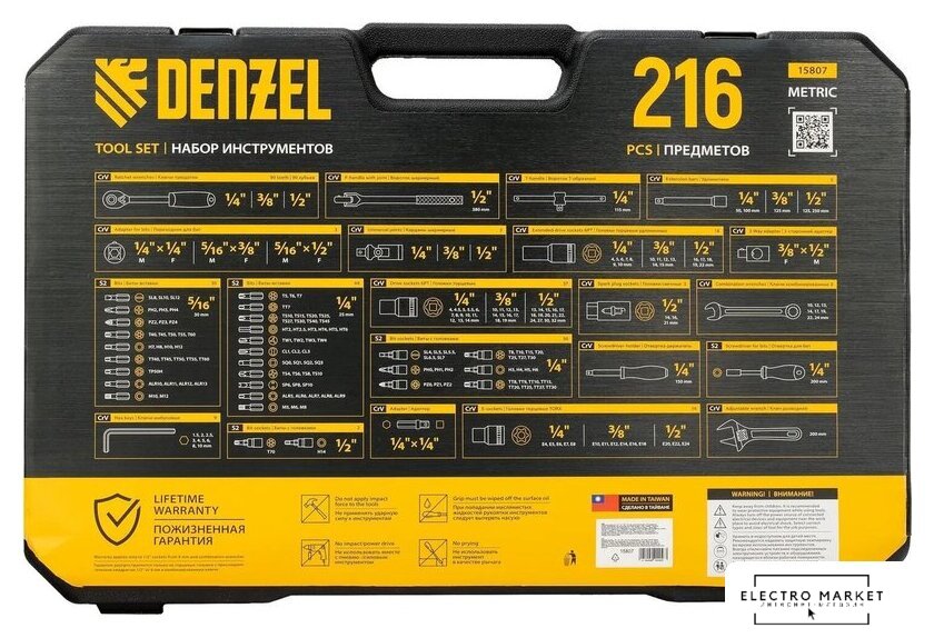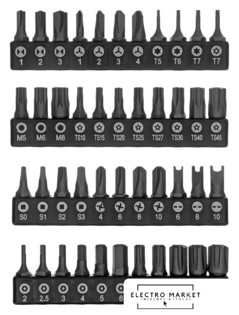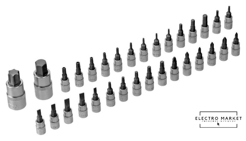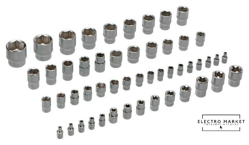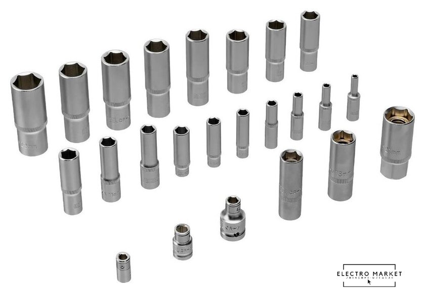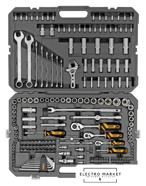 | Комплектация | Ключ-трещотка 1/4", 3/8", 1/2"3 штВороток шарнирный 1/2": 380 мм1 штВороток Т-образный 1/4": 115 мм1 штУдлинители 1/4": 50, 100 мм2 штУдлинитель 3/8": 125 мм1 штУдлинители 1/2": 125, 250 мм2 штПереходник для бит 1/4"-1/4"1 штПереходник для бит 3/8"-5/16"1 штПереходник для бит 1/2"-5/16"1 штКардан: 1/4", 3/8", 1/2"3 штКлюч разводной тонкие губки: 200 мм1 штОтвертка-держатель 2К-рукоятка 1/4": 150 мм1 штОтвертка для бит 2К-рукоятка 1/4": 200 мм1 штАдаптер с шестигранника на квадрат 1/4"-1/4"1 шт3-сторонний адаптер 3/8"-1/2"1 штГоловки торцевые 1/4"5 штГоловки торцевые 3/8"6 штГоловки торцевые 1/2"3 штГоловки торцевые удлиненные 1/4"7 штГоловки торцевые удлиненные 3/8"6 штГоловки торцевые удлиненные 1/25 штГоловки торцевые 1/4"13 штГоловки торцевые 3/8"10 штГоловки торцевые 1/2"14 штКлючи имбусовые9 штБиты с головками 1/2"12 штБиты-вставки 5/16", 30 мм30 штБиты-вставки 1/4", 25 мм44 шт |