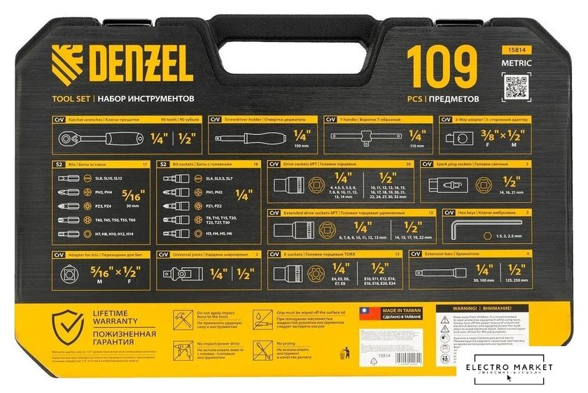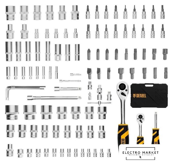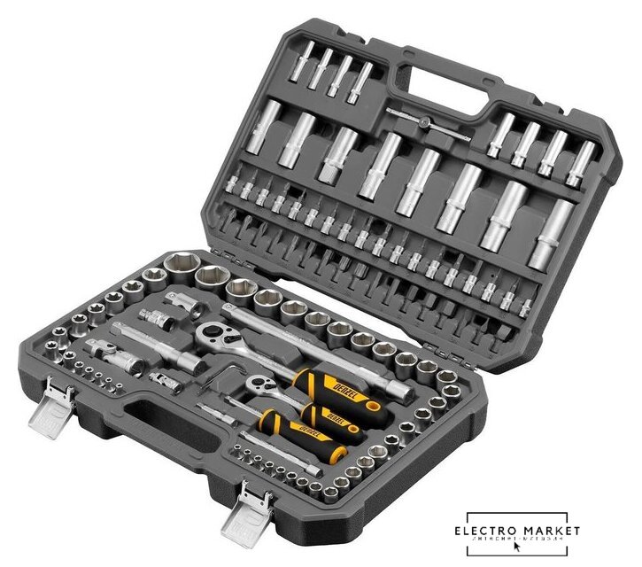 | Комплектация | Ключ-трещотка 1/2", 1/4"2 штВороток Т-образный 1/4": 115 мм1 штКардан: 1/4", 1/2"2 штПереходник для бит 1/2"-5/16"1 штУдлинители 1/4": 50, 100 мм2 штУдлинители 1/2": 125, 250 мм2 штПрисоединительный квадрат воротка 1/2"1 штОтвертка-держатель 2К-рукоятка 1/4": 150 мм1 штКлючи имбусовые3 штГоловки свечные магнитные3 штГоловки торцевые 1/4"13 штГоловки торцевые 1/2"17 штГоловки торцевые удлиненные 1/4"7 штГоловки торцевые удлиненные 1/2"5 штГоловки торцевые 1/4"5 штГоловки торцевые 1/2"8 штБиты-вставки 5/16", 30 мм17 штБиты с головками 1/4"18 штПластиковый кейс1 шт |
