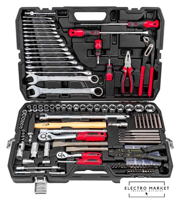 Комплектация | Инструменты в наборетрещотка (2 шт.), отвертка (4 шт.), пассатижи (1 шт.), плоскогубцы (1 шт.), молоток (1 шт.), зубило (2 шт.), съемник изоляции (1 шт.), ключ гаечный (17 шт.)Трещотка1/2″ (72 зубца), 1/4″ (72 зубца)Отверткишлицевая (SL) (2 шт.), крестовая (PH) (2 шт.)Доп. комплектациярукоятка (1 шт.), кейс (пластиковый), выколотки (5 шт.), коннекторы (21 шт.)Оснасткаголовки (30 шт.), насадки-биты (43 шт.), удлинители (6 шт.), кардан (2 шт.), держатель (2 шт.)Головкиторцевые шестигранные (28 шт.), свечные (2 шт.)Торцевые шестигранные головки1/2″ (10, 11, 12, 13, 14, 15, 16, 17, 18, 19, 20, 21, 22, 23, 24, 27, ), 1/4″ (4, 5, 6, 7, 8, 9, 10, 11, 13 мм)Насадки-битышлицевые (SL) (1/4": SL3, SL4, SL5.5, SL7; 5/16": SL4.5, SL5, SL7), крестовые (PH) (1/4": PH0, PH1, PH2, PH3; 5/16": PH1, PH2, PH3), шестигранные (Hex) (1/4": Н3, Н4, Н5, Н6, Н7; L=75 мм: Н4, Н5, Н6, Н7, Н8, Н10, Н12), звездочкой (Torx) (1/4": 10, 15, 20, 25, 27, 30; 5/16": 10, 20, 25, 27, 30, 40, 45,)Удлинители1/2″ (75, 250 мм), 1/4″ (50, 100 мм), гибкий удлинитель (1/4", 1/2")Кардан1/2″, 1/4″Ключивороток (1 шт.), комбинированный (16 шт.)ВороткиT-образныйРазмер ключа8 мм, 10 мм, 11 мм, 12 мм, 13 мм, 14 мм, 15 мм, 17 мм, 16 мм, 19 мм, 22 мм, 24 мм, 6 мм, 7 мм, 9 мм, 27 мм |