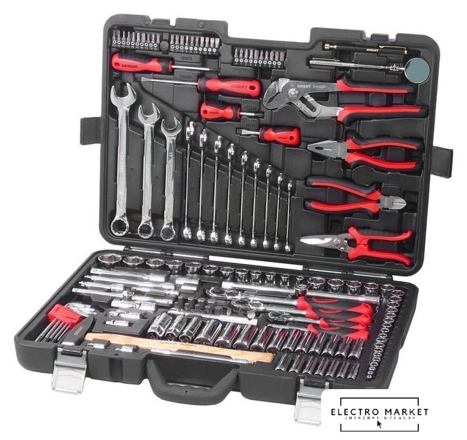 | Комплектация | - 1/4":Головки торцевые – 4; 5; 6; 7; 8; 9; 10; 11; 12 ммГоловки торцевые удлиненные – 6; 7; 8; 9; 10; 11; 12 ммТрещоточная рукоятка 72 зубцаУдлинитель гибкий – 150 ммУдлинитель – 75 ммШарнир карданныйВороток шарнирныйПереходник 1/4"F×3/8"MОтвертка-держательБиты 1/4" шестигранные – H1,5; H2; H2,5; H3; H4; H5; H6Биты 1/4" Torx – T10; T15; T20; T25; Т27; Т30Биты 1/4" шлицевые – SL3; SL4; SL4,5; SL5; SL5,5; SL6; SL7Биты 1/4" крестовые Phillips – PH0; PH1; PH2; PH3; PH4Биты 1/4" крестовые Pozidrive – PZ0; PZ1; PZ2; PZ3; PZ4Держатель для бит 1/4"SDR×1/4"HDR- 3/8":Головки торцевые – 8; 9; 10; 11; 12; 13; 14; 15; 16; 17; 18; 19; 21; 22 ммГоловки торцевые удлиненные – 8; 9; 10; 11; 12; 13; 14; 15; 17; 19; 22 ммГоловки свечные – 14; 16 ммТрещотка с быстрым сбросом 72 зубцаУдлинители – 75; 150 ммШарнир карданныйВороток Т-образныйПереходник 3/8"M×1/4"F- 1/2":Головки торцевые – 8; 10; 12; 13; 14; 17; 19; 21; 22; 24; 27; 30 ммГоловка свечная – 21 ммТрещотка с быстрым сбросом 72 зубцаУдлинители – 125; 250 ммШарнир карданныйАдаптер трехсторонний 1/2"M×3/8"FБиты 5/16" шестигранные – H8; H10; H12; Н14Биты 5/16" Torx с отверстием – T40; T45; T50; T55; Т60Биты 5/16" шлицевые – SL8; SL10; SL12Держатель для бит 1/2"SDR×5/16"HDR- Ключи комбинированные – 8; 9; 10; 11; 12; 13; 14; 15; 16; 17; 19; 22 мм- Ключи угловые Torx – T10; T15; T20; T25; T27; T30; T40; T45; T50- Пассатижи – 180 мм- Бокорезы – 160 мм- Молоток – 300 г- Ножницы универсальные – 170 мм- Клещи переставные – 250 мм- Отвертки крестовые Phillips – PH 1×75 мм; РН 2×40 мм- Отвертки шлицевые Slotted – SL 5×100 мм; SL 6×40 мм- Телескопическая магнитная рукоятка- Телескопическое инспекционное зеркало |