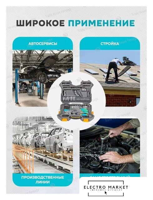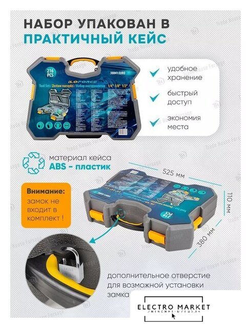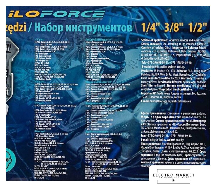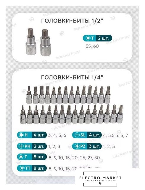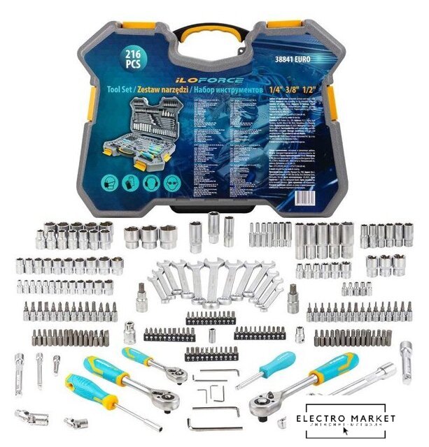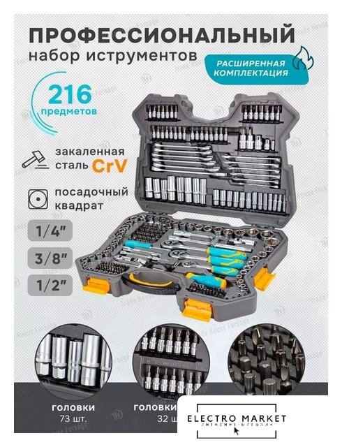 | Комплектация | головки 103 шт., насадки-биты 74 шт., удлинители 5 шт., кардан 3 шт., адаптер 4 шт., трещотка 3 шт., отвертка-держатель бит 1 шт., ключи комбинированные 12 шт., ключи шестигранные Г-образные 7 шт. |