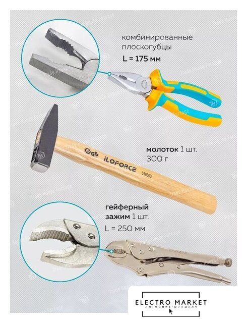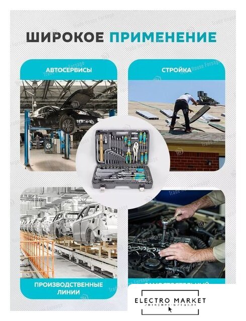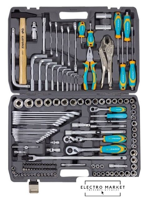 | Комплектация | трещотка (3 шт.), отвертка (6 шт.), плоскогубцы (1 шт.), молоток (1 шт.), ключ гаечный (35 шт.), головки (55 шт.), насадки-биты (26 шт.), удлинители (8 шт.), кардан (3 шт.), держатель (1 шт.), адаптер (2 шт.), кейс (пластиковый) |