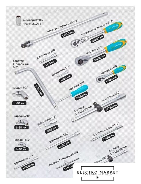 | Т-образный вороток | 1/2", 3/8", 1/4" |