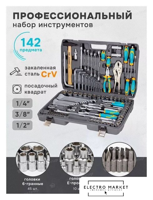 универсальный набор, 1/4", 3/8", 1/2", 142 предмета