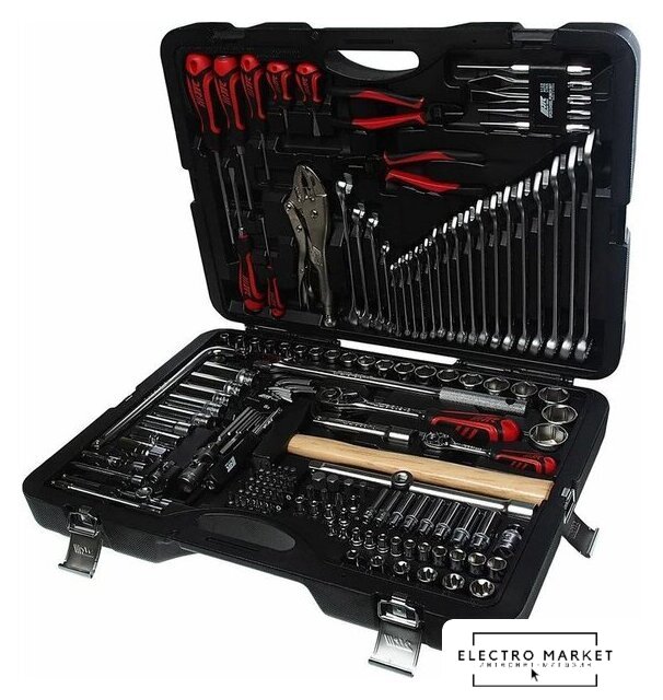 | Комплектация | 12 шт. головки 1/4" (6РТ): 4, 4.5, 5, 5.5, 6, 7, 8, 9, 10, 11, 12, 13 мм.8 шт. головки глубокие 1/4" (6РТ): 6, 7, 8, 9, 10, 11, 12, 13 мм.5 шт. головки TORX 1/4": Е4, Е5, Е6, Е7, Е8.20 шт. головки 1/2" (6РТ): 8, 9, 10, 11, 12, 13, 14, 15, 16, 17, 18, 19, 20, 21, 22, 23, 24, 27, 30, 32 мм.5 шт. головки глубокие 1/2" (6РТ): 14, 15, 17, 19, 22 мм.6 шт. головки TORX 1/2": Е10, Е12, Е14, Е16, Е18, Е20.1 шт. трещотка 1/4".3 шт. удлинитель 1/4", 50 мм., 100 мм., 150 мм.1 шт. кардан 1/4".1 шт. вороток-отвертка 1/4", 150 мм.1 шт. держатель для бит 1/4".1 шт. переходник 3/8"(F)х1/4"(М).1 шт. свечная головка 1/2", 14 мм. (12РТ)2 шт. свечная головка 1/2", 16 мм. (6РТ) и 21 мм. (6РТ)1 шт. трещотка 1/2", 72 зубца.2 шт. удлинитель 1/2", 125 мм. и 250 мм.1 шт. кардан 1/2".1 шт. переходник 3/8"(F)х1/2"(М).1 шт. держатель для бит 5/16".1 шт. вороток с шарниром 380 мм.1 шт. вороток Г-образный 260 мм.- 27 шт. биты 1/4": (S2, длина 25 мм.):6 шт. HEX: 2, 2.5, 3, 4, 5, 6 мм.7 шт. TORX (с отверстием): Т10Н, Т15Н, Т20Н, Т25Н, Т27Н, Т30Н, Т40Н.7 шт. TORX: Т10, Т15, Т20, Т25, Т27, Т30, Т40.3 шт. SL: 4, 5.5, 6.5 мм.2 шт. PZ: PZ1, PZ2.2 шт. РН: РН1, РН2.- 7 шт. биты 5/16": (S2, длина 30 мм.):1 шт. РН: РН3.4 шт. HEX: 8, 10, 12, 14 мм.2 шт. TORX: Т45, Т50.- 17 шт. ключ рожково-накидной: 6, 7, 8, 9, 10, 12, 13, 14, 15, 16, 17, 18, 19, 21, 22, 24 мм.4 шт. ключ разрезной: 8х10, 11х13, 12х14, 17х19 мм.9 шт. Г-образный ключ HEX: 1.5, 2, 2.5, 3, 4, 5, 6, 8, 10 мм.1 шт. пассатижи 7".1 шт. бокорезы 6".1 шт. клещи с фиксатором 10".1 шт. молоток 500 г.- 5 шт. набор выколоток и зубил:1 шт. выколотка (4х9.5х150 мм.).1 шт. коническое зубило (5х9.5х130 мм.).1 шт. зубило (12х9.5х130 мм.).1 шт. коническая выколотка (3х9.5х120 мм.).1 шт. кернер (2х9.5х120 мм.)- 7 шт. отвертки с антискользящей рукояткой:4 шт. РН: РН1х75 мм., РН2х38 мм. (укороч.), РН2х100 мм. (ударная), РН3х150 мм.,3 шт. SL: 3х75 мм., 6.5х38 мм. (укороч.), 6.5х100 мм. (ударная).Кейс. |