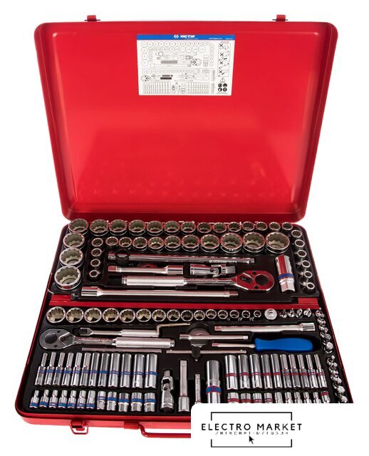 | Комплектация | - Шестигранники L-типа 1.5, 2, 2.5 мм KING TONY 1115-03;- Отвертка вороток 1/4" KING TONY 2178AE;- Вороток 1/4", с шарниром KING TONY 2452-05F;- Вороток 1/4", скользящий KING TONY 2571-45;- Трещотка 3/8", флажковая KING TONY 3769-08F;- Кардан 3/8" KING TONY 3792;- Переходник 3/8">1/4" KING TONY 3812;- Вороток 1/2", скользящий KING TONY 4572-10;- Трещотка 1/2", флажковая KING TONY 4768-10F;- Кардан 1/2" KING TONY 4791R;- Головка свечная двенадцатигранная 1/2", 21 мм, L = 70 мм, резиновый фиксатор KING TONY 463021R;- Головка свечная шестигранная 1/2", 16 мм, L = 70 мм, резиновый фиксатор KING TONY 463516R;- Cross bar. 4-1/2"L KING TONY 2561;- Удлинитель 3/8", 75 мм KING TONY 3221-03;- Удлинитель 3/8", 150 мм KING TONY 3221-06;- Удлинитель 1/4", 50 мм KING TONY 2221-02;- Удлинитель 1/4", 100 мм KING TONY 2221-04;- Удлинитель 1/2", 125 мм KING TONY 4251-05R;- Удлинитель 1/2", 250 мм KING TONY 4251-10R;- 3/8" drive spin disc KING TONY 3840;- 1/2" drive spin disc KING TONY 4840;- Насадки (биты) торцевые 1/4", Phillips, PH1, PH2, PH3, PH4, KING TONY 2011;- Насадки (биты) торцевые 1/4", HEX, 3, 4, 5, 6, 8, 10, KING TONY 2015M;- Насадки (биты) торцевые 1/4", HEX, 1/8", 3/16", 7/32", 1/4", 5/16", 3/8", KING TONY 2015S;- Торцевые головки KING TONY серии 3330M, размеры: 8, 9, 10, 11, 12, 13, 14, 15, 16, 17, 18, 19, 20, 21, 22 мм;- Торцевые головки KING TONY серии 2235M, размеры: 4, 4.5, 5, 5.5, 6, 7, 8, 9, 10, 11, 12, 13 мм;- Торцевые головки KING TONY серии 2235S, размеры: 5/32", 3/16", 7/32", 1/4", 9/32", 5/16", 11/32", 3/8", 7/16", 1/2";- Головки торцевые стандартные шестигранные 1/4", KING TONY серии 2335M: 4, 4.5, 5, 5.5, 6, 7, 8, 9, 10, 11, 12, 13 мм;- Головки торцевые стандартные шестигранные 1/4", KING TONY серии 2335S: 5/32", 3/16", 7/32", 1/4", 9/32", 5/16", 11/32", 3/8", 7/16", 1/2";- Головки торцевые стандартные двенадцатигранные 1/2", KING TONY серии 4330M: 8, 9, 10, 11, 12, 13, 14, 15, 16, 17, 18, 19, 20, 21, 22, 23, 24, 25, 26, 27, 28, 30, 32 мм;- Головки торцевые стандартные двенадцатигранные 1/2", дюймовые, KING TONY серии 4330S: 3/8", 7/16", 1/2", 9/16", 5/8", 11/16", 3/4", 13/16", 7/8", 15/16", 1", 1-1/8", 1-3/16", 1-1/4";- Металлический футляр. |