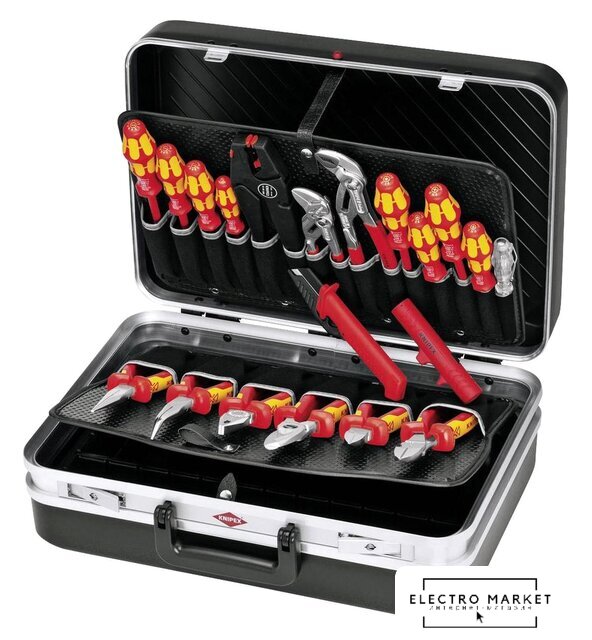 | Комплектация | - Плоскогубцы комбинированные 180 mm- Стрипер самонастраивающийся 200 mm- ErgoStrip®, Универсальный инструмент для удаления оболочки- Плоские круглогубцы с режущими кромками, (круглогубцы с прямыми плоскими длинными губками, с режущей кромкой) 200 mm - 2шт.- Кусачки боковые 160 mm- Кусачки боковые особой мощности- Клещи переставные-гаечный ключ, переставные клещи и гаечный ключ в одном инструменте 180 mm- Cobra®, Высокотехнологичные сантехнические клещи 250 mm- Ножницы для резки кабелей, с двойными режущими кромками 200 mm- Отвертка для винтов с шлицевыми головками- Отвертки для винтов с шлицевой головкой (тонкая) - 3шт.- Крестовая отвёртка (тонкая), Phillips® - 2шт.- Крестовая отвёртка (тонкая), Pozidriv® - 2шт.- Резак для кабелей- Индикатор напряжения, однополюсный, 247 |