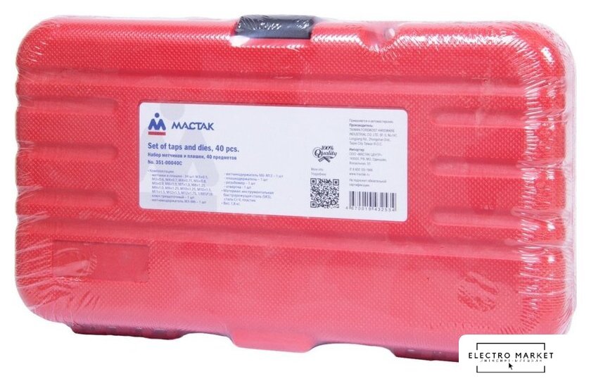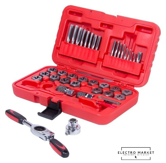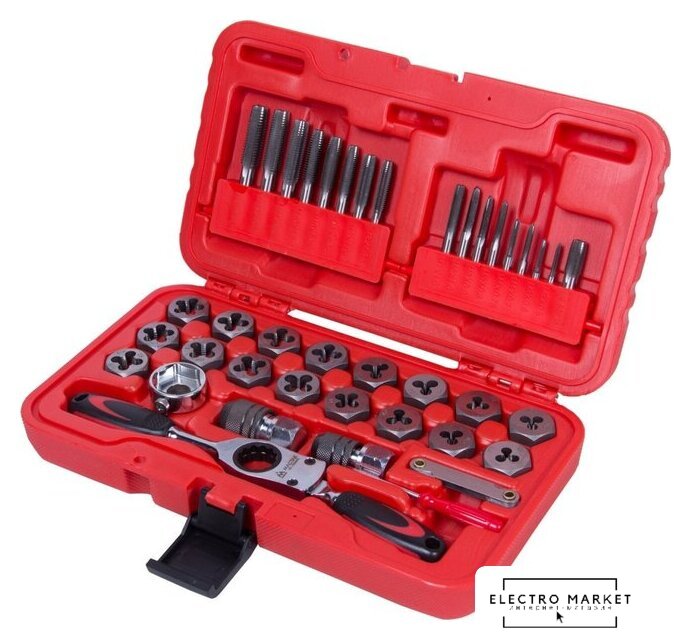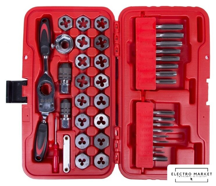 | Комплектация | Метчики и плашки - 34 шт; Ключ трещоточный – 1 шт.; Метчикодержатель M3-M6 – 1 шт.; Метчикодержатель M6-M12 – 1 шт.; Плашкодержатель – 1 шт.; Резьбомер – 1 шт.; Отвертка - 1 шт. |