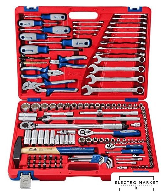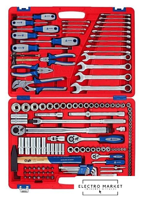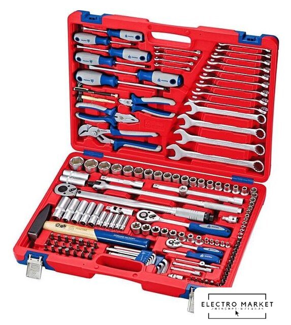 | Комплектация | – Головки торцевые и принадлежности 1/2"Головки торцевые стандартные 6-гранные – 8, 9, 10, 11, 12, 13, 14, 15, 16, 17, 18, 19, 21, 22, 24, 27, 30, 32 ммГоловки торцевые глубокие 6-гранные – 13, 14, 17, 19, 22 ммГоловки торцевые TORX Е-стандарт – E10, E12, E14, E16, E18, E20, E22, E24Головки свечные 12-гранные – 14, 16 ммУдлинители стандартные – 125, 250 ммТрещотка флажковая с кнопкой – 45 зубцов, длина 250 ммВороток с шарниром – 450 ммКардан – 1 шт.Переходник с отверстием для воротка – 3/8" х 1/2"Переходник адаптер для вставок (бит) – F1/2">F5/16" (8 мм)Ключ динамометрический – диапазон усилий: от 42 до 210 Нм– Головки торцевые и принадлежности 1/4"Головки торцевые стандартные 6-гранные – 4, 4.5, 5, 5.5, 6, 7, 8, 9, 10, 11, 12, 13 ммГоловки торцевые глубокие 6-гранные – 8, 10, 11, 12, 13 ммГоловки торцевые TORX Е-стандарт – E4, E5, E6, E7, E8Удлинители стандартные – 75, 100 ммТрещотка флажковая с кнопкой – 45 зубцов, длина 125 ммВороток скользящий Т-образный – 115 ммКардан – 1 шт.Отвертка-вороток – 150 мм– Насадки торцевые 1/4" (6.35 мм)Крестовые Phillips – PH1, PH2Крестовые Pozidrive – PZ1, PZ2Шлицевые Slotted – 5.5, 7 ммTORX – T8, T10, T15, T20, T25, T27, T30Шестигранные – H3, H4, H5, H6, H7– Вставки (биты) 5/16" (8 мм)Крестовые Phillips – PH3, PH4Крестовые Pozidrive – PZ3, PZ4Шлицевые Slotted – 8, 10, 12 ммTORX – T40, T45, T50, T55, T60Шестигранники – Н3, Н4 ,H5, H6, H7SPLINE – M6, M8, M10, M12– КлючиКлючи комбинированные – 6, 7, 8, 9, 10, 11, 12, 13, 14, 15, 16, 17, 18, 19, 21, 22, 24 мм– ОтверткиКрестовые Phillips – №1 х 75 мм, №2 х 100 мм, №3 х 150 ммШлицевые Slotted – 5.5 х 75 мм, 6.5 х 100 мм, 8.0 х 150 мм– Шарнирно-губцевый инструментПлоскогубцы комбинированные – длина 175 ммБокорезы стандартные – длина 150 ммЗахват переставной – длина 250 мм– Прочий инструментНабор шестигранников – 1.5, 2, 2.5, 3, 4, 5, 6, 8, 10 ммМолоток – 500 грМагнит телескопический – 1 шт.Индикатор напряжения – 6-24 В |