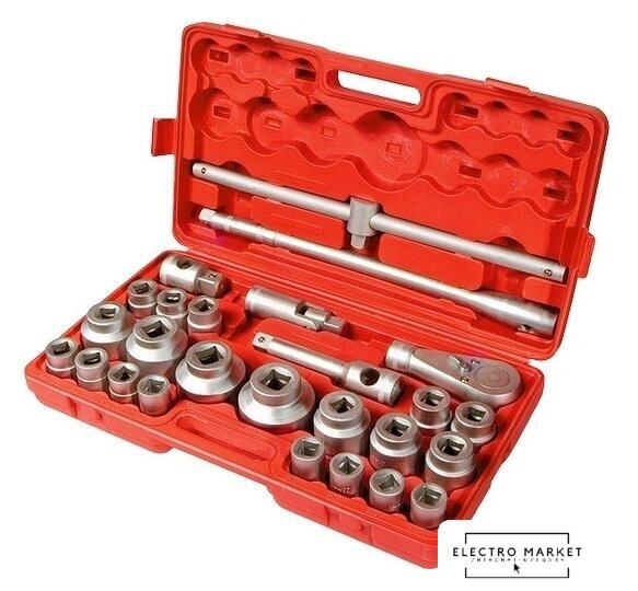 | Комплектация | - Головки торцевые: 21 мм, 22 мм, 23 мм, 24 мм, 26 мм, 27 мм, 28 мм, 29 мм, 30 мм, 31 мм, 32 мм, 34 мм, 38 мм, 41 мм, 46 мм, 50 мм, 35 мм, 55 мм, 60 мм, 65 мм- Удлинители: 200 мм, 525 мм- Другие предметы 3/4": вороток Т-образный, карданный шарнир, трещотка, переходник 3/4"DR(F)х1"DR(M) |