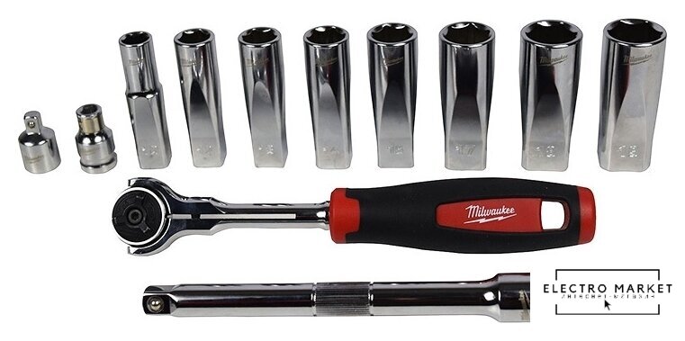 Комплектация | - Трещотка 3/8"- Торцевая головка 3/8": 10, 12, 13, 14, 15, 17, 18, 19 мм- Адаптер 3 шт. |