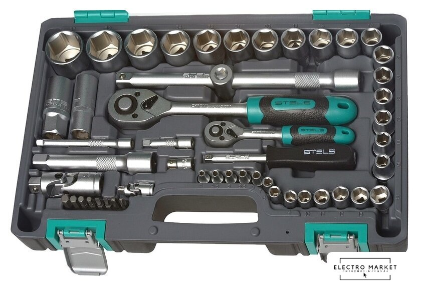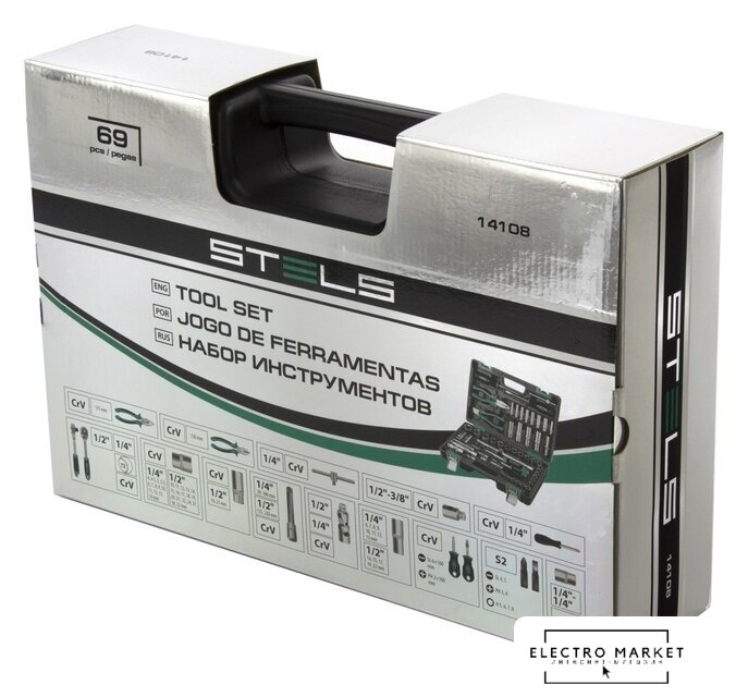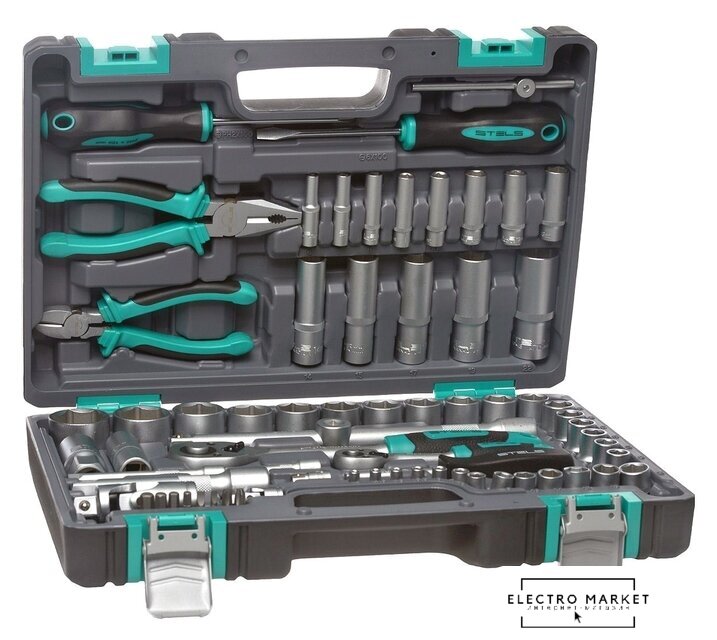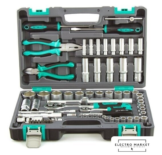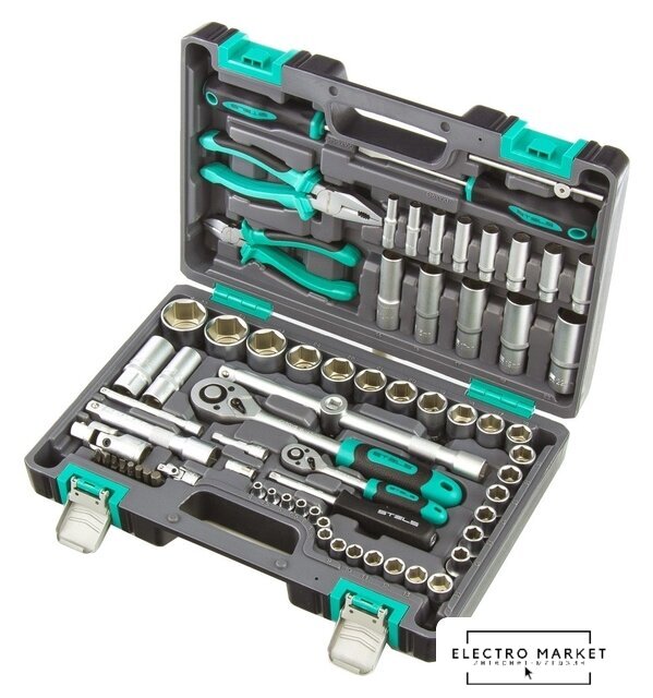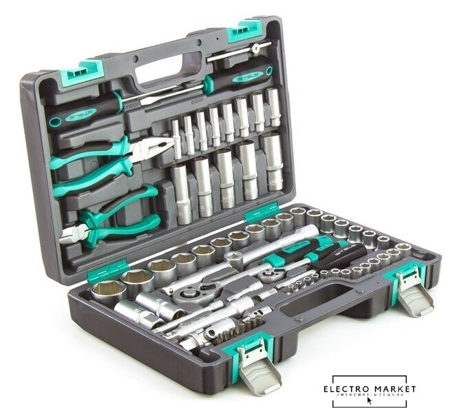 Комплектация | - Ключ трещоточный 1/4.- Ключ трещоточный 1/2.- Головки торцевые 1/2" 10, 11, 12, 13, 14, 15, 16, 17, 18, 19, 20, 21, 22, 24, 27, 30, 32.- Головки торцевые 1/4" 4, 4.5, 5, 5.5, 6, 7, 8, 9, 10, 11, 12, 13, 14.- Головки свечные 21 мм и 16 мм.- Удлинители 1/2: 125 и 250 мм.- Удлинители 1/4: 100 мм и 50 мм.- Кардан на 1/2 и 1/4.- Вороток Т-образный 1/4.- Головка торцевая удлиненная 1/2 ” 14, 15, 17, 19, 22.- Головка торцевая удлиненная 1/4” 6, 7, 8, 9, 10, 11, 12, 13.- Бокорезы 175 мм.- Пассатижи 175 мм.- Переходник бит 1/4->1/4.- Переходник 1/2F - 3/8M.- Отвертка-держатель 1/4.- Отвертки SL6 x 100 PH2 x 100.- Биты Т10, Т15, Т20. SL3, SL4. PH1, PH2. |