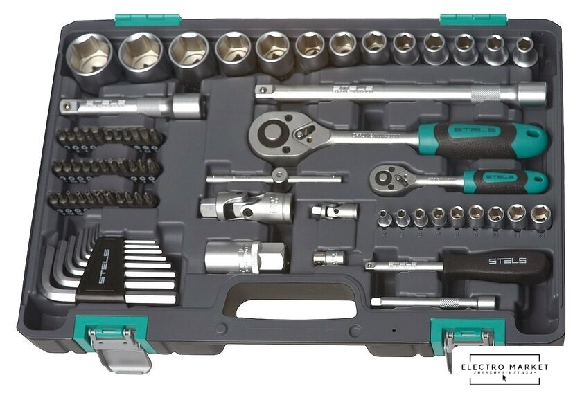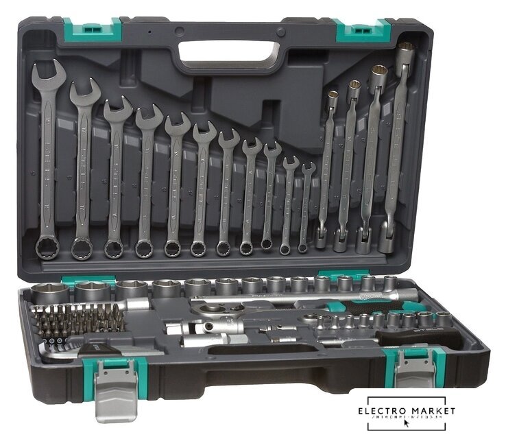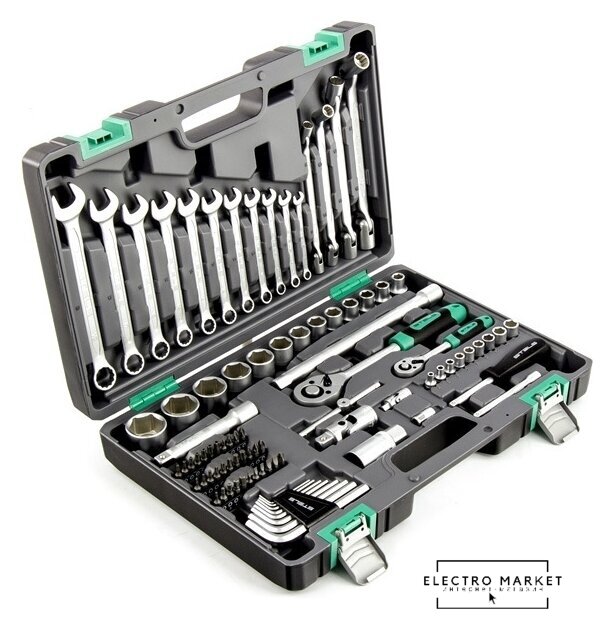 | Комплектация | - Ключ трещоточный 1/2.- Ключ трещоточный 1/4.- Головки торцевые 1/2: 10, 11, 12, 13, 14, 15, 17, 19, 22,24, 27, 30, 32 мм.- Головки торцевые 1/4: 4, 5, 6, 7, 8, 9, 10, 11, 12 мм.- Ключи комбинированные 6,7,8,9,10,11,12,13,14,17,19.- Ключи шарнирные 8х9, 10х11, 12х13, 14х15.- Кардан 1/2.- Кардан 1/4.- Удлинитель 1/2, соединение под ключ 120 мм и 250 мм.- Удлинитель 1/4, соединение под ключ 100 мм.- Отвертка-держатель 1/4.- Вороток Т-образный 1/4.- Угловые шестигранные ключи 2 мм, 2.5 мм, 3 мм, 4 мм, 5 мм, 6 мм, 8 мм, 10 мм.- Головки свечные 1/2 16 мм и 21 мм.- Переходник бит 1/4->1/4.- Биты 1/4" Т10, Т15, Т20, Т25, Т27, Т30, T40. ТТ10, ТТ15, ТТ20, ТТ25, ТТ27, ТТ30, ТT40. SL 4, SL 5.5, SL 7. Н2, Н3, Н4, Н5, Н6, Н7, Н8, Н10. PZ 0, PZ 1, PZ 2, PZ 3. РН0, РН1, РН2, PH3. |