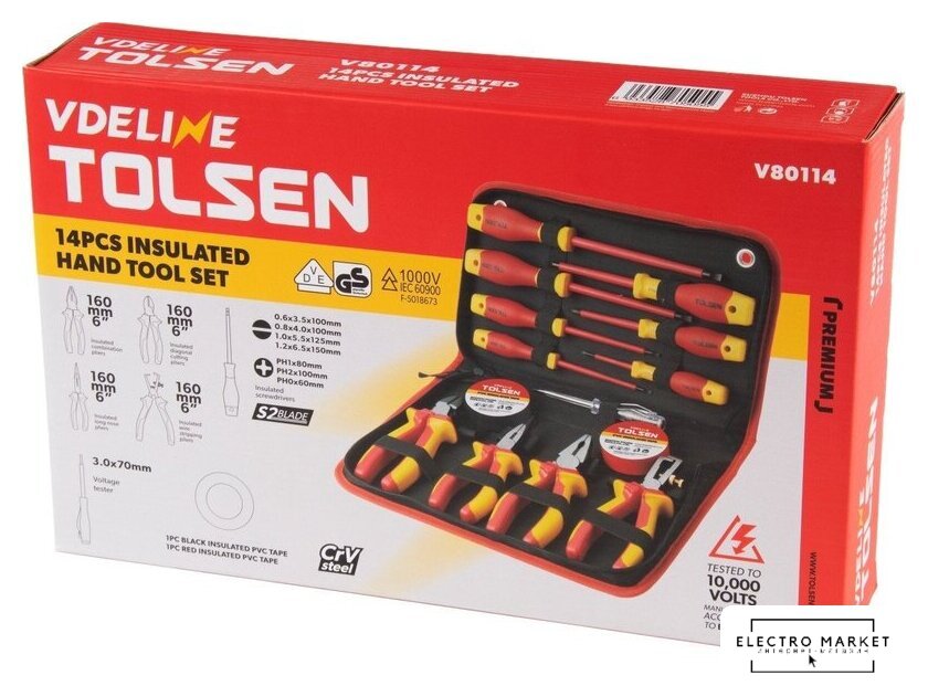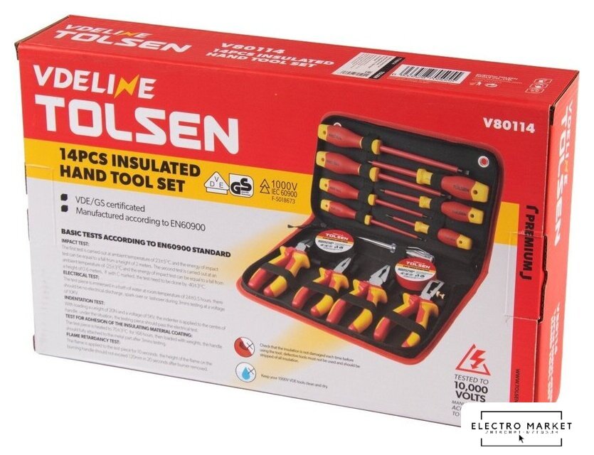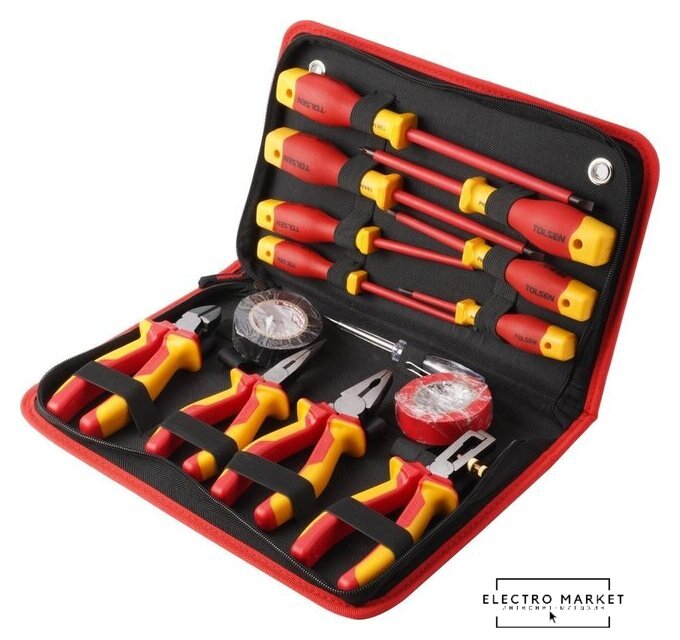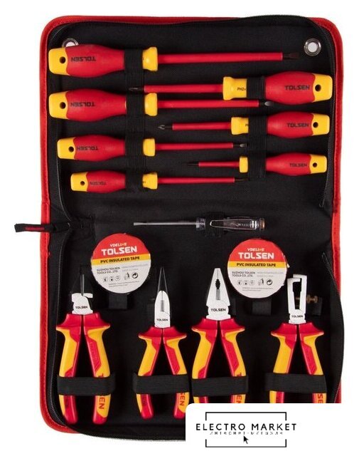 | Комплектация | Отвёртки диэлектрические, шарнирно-губцевый инструмент диэлектрический, тестер-отвёртка для проверки напряжения, изоляционная лента PVC |