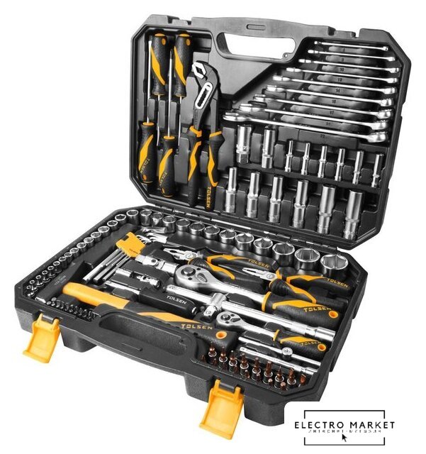 | Комплектация | – Головки и принадлежности 1/2"Короткие 6-гранные – 13, 14, 15, 16, 17, 18, 19, 20, 21, 22, 23, 24, 27, 30, 32 ммГлубокие 6-гранные – 10, 12, 13, 14, 17, 19 ммСвечные 6-гранные – 16, 21 мм (резиновый фиксатор)Трещотка флажковая с кнопкой 72 зубцаУдлинитель 250 ммКарданПереходник 3/8">1/2" с отверстием для удлинителя– Головки и принадлежности 1/4"Короткие 6-гранные – 4, 4.5, 5, 5.5, 6, 7, 8, 9, 10, 11, 12, 13, 14 ммГлубокие 6-гранные – 4, 5, 6, 7, 8, 9 ммТрещотка флажковая с кнопкой 72 зубцаВороток скользящий Т-типа 115 ммОтвертка-вороток 150 ммУдлинитель 100 ммКарданДержатель вставок (бит) 1/4" 25 мм– Насадки (биты) торцевые 1/4" 38 ммPHILLIPS – PH1, PH2POZIDRIVE – PZ1, PZ2SLOTTED – SL4.0, SL5.5, SL6.5 ммTORX – T8, T10, T15, T20, T25, T30HEX – H3, H4, H5, H6– Вставки (биты) 1/4" 25 ммPHILLIPS – PH1, PH2, PH3POZIDRIVE – PZ1, PZ2, PZ3SLOTTED – SL4.0, SL5.5, SL6.5 ммTORX TR – T10H, T15H, T20H, T25H, T27H, T30HHEX – H3, H4, H5, H6Адаптер для головок 1/4">1/4" 25 мм– КлючиКомбинированные – 6, 8, 10, 12, 14, 15, 17, 19, 22 мм– ОтвёрткиPHILLIPS – PH1×100, PH2×150 ммSLOTTED – SL 1.0×5.5x100, 1.2×6.5×150 мм– Шарнирно-губцевый инструментПассатижи комбинированные 175 ммПассатижи тонконосые 200 ммЗахват переставной 250 мм– Вспомогательный инструментНабор шестигранников L-типа – H1.5, H2, H2.5, H3, H4, H5, H6, H8, H10Молоток 300 гр |