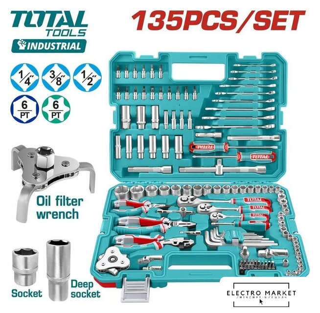 | Комплектация | Трещотки и привод:Трещоточные ключи — 3 шт.: 1/4", 3/8", 1/2"Универсальные шарниры — 3 шт.: 1/4", 3/8", 1/2"Вороток-спиннер — 1 шт.: 1/4" × 150 ммДержатель бит — 1 шт.: 1/4" × 6,35 ммГоловки:Головки 1/4" — 13 шт.: 4; 4,5; 5; 5,5; 6; 7; 8; 9; 10; 11; 12; 13; 14 ммГоловки 3/8" — 9 шт.: 9; 10; 11; 12; 13; 14; 15; 16; 17 ммГоловки 1/2" — 9 шт.: 18; 19; 20; 21; 22; 24; 27; 30; 32 ммTORX головки 3/8" — 8 шт.: E6, E8, E10, E11, E12, E14, E16, E18Удлинённые головки 1/4" — 4 шт.: 5; 6; 7; 8 ммУдлинённые головки 3/8" — 6 шт.: 10; 12; 13; 14; 15; 17 ммСвечные головки 1/2" — 1 шт.: 21 ммСвечные головки 3/8" — 2 шт.: 16 мм и 18 ммУдлинители и адаптеры:Удлинители 1/4" — 2 шт.: 50 мм (2"), 100 мм (4")Удлинители 3/8" — 2 шт.: 75 мм (3"), 150 мм (6")Удлинители 1/2" — 2 шт.: 125 мм (5"), 250 мм (10")Переходник 1/4" — 1 шт.: 3/8"(F) × 1/4"(M)Переходник 1/2" — 1 шт.: 3/8"(F) × 1/2"(M)Переходник — 1 шт.: 1/2"(F) × 3/8"(M)Биты и бит-головки:Биты 1/4" × 25 мм — 26 шт.:PH0, PH1×2, PH2×2, PH3,PZ0, PZ1, PZ2, PZ3,SL4, SL5, SL6, SL7,H2, H3, H4, H5, H6,T10H, TT15, TT20, TT25, TT27, TT30, TT40Бит-головки 1/4" × 37 мм — 16 шт.:PH1, PH2, PZ1, PZ2, SL5.5, SL6.5,T9, T10, T15, T20, T25, T30,H3, H4, H5, H6Ключи и ручной инструмент:Комбинированные ключи — 9 шт.: 6; 8; 10; 12; 13; 14; 15; 17; 19 ммОтвёртки — 2 шт.: SL6×150 мм, PH2×150 ммШестигранные ключи (HEX) — 9 шт.: 1,5; 2; 2,5; 3; 4; 5; 6; 8; 10 ммПассатижи комбинированные усиленные — 1 шт. (8")Плоскогубцы усиленные — 1 шт. (8")Длинногубцы усиленные — 1 шт. (6")Съёмник масляного фильтра, 3-кулачковый — 1 шт.Упаковка:Прочный кейс для хранения и транспортировки |