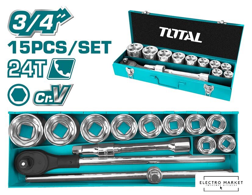 Комплектация | Торцевые головки: 30мм, 32мм, 34мм, 36мм, 38мм, 41мм, 46мм, 50мм, 55мм, 60мм - 10 шт.Ключ-трещотка - 1 шт.Удлинители 100мм, 200мм - 2 шт.Тройник выдвижной 3/4" 520мм - 1 шт.Кейс металлический |