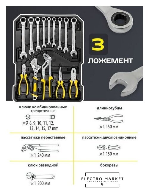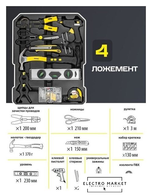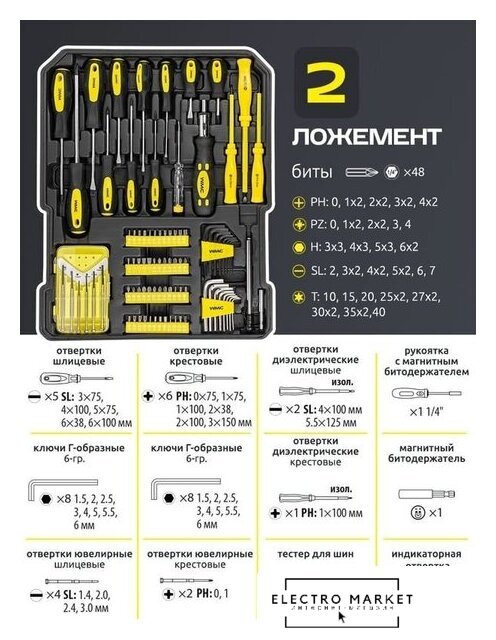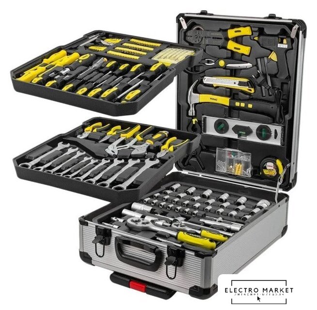 | Комплектация | - Свечные головки 16 и 21 мм- Трещотки 1/4" и 1/2"- Карданы 1/4" и 1/2"- Т-образный вороток 1/4" 110 мм- Т-образный вороток 1/2" 250 мм- Рукоятка 1/4"- Удлинитель 1/2" 125 мм- Удлинители 1/4" 50 и 100 мм- Гибкий удлинитель 150 мм- Головки торцевые 1/4" 4, 4.5, 5, 5.5, 6, 6.5, 7, 7.5, 8, 9, 10, 11, 12, 13, 14 мм- Головки торцевые 1/2" 8, 9, 10, 11, 12, 13, 14, 15, 16, 17, 18, 19, 20, 30 мм- Отвертки SL3x75, SL4x100, SL5x75, SL6x38, SL6x100, РН0х75, РН1х75, РН1х100, РН2х38, РН2х100, РН3х150- Отвертки изолированные SL4х100, SL5.5х125- Рукоятка с магнитным битодержателем 1/4"- Г-образные шестигранные ключи 1.5, 2, 2.5, 3, 4, 5, 5.5, 6 мм- Отвертки диэлектрические РН1х100 мм- Магнитный битодержатель- Отвертки ювелирные SL1.4, 2.0, 2.4, 3.0 мм- Отвертки ювелирные РН0, РН1- Тестер для шин- Индикаторная отвертка 100-250 В- Комбинированные ключи 8, 9, 10, 11, 12, 13, 14, 15, 17 мм- Длинногубцы 150 мм- Клещи переставные 240 мм- Пассатижи двухпозиционные 150 мм- Ключ разводной 200 мм- Бокорезы 150 мм- Щипцы для зачистки проводов 200 мм- Ножницы 210 мм- Рулетка 3 м- Молоток-гвоздодер 370 г- Нож канцелярский 150 мм- Набор крепежа (130 предметов)- Уровень 230 мм- Изолента 8 м- Клеевой пистолет- Клеевые стержни 2 шт.- Струбцины пружинные 2 шт.- Кейс |