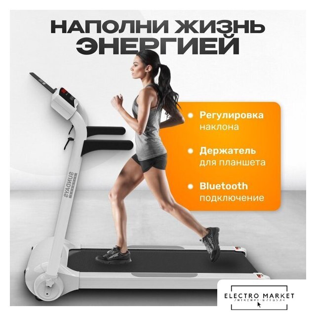 электрическая беговая дорожка, ручная ступенчатая регулировка угла наклона, полотно: 41×119 см, скорость движения: 1–16.8 км/ч, 12 программ тренировок