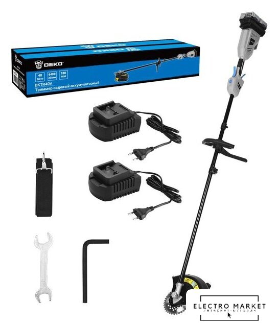 Комплектация | Триммер (поставляется в частично разобранном виде: основной корпус, штанга, защитный кожух, рукоятка) – 1 шт.Аккумулятор 20В – 2 шт.Зарядное устройство – 2 шт.Ремень – 1 шт.Триммерная головка – 1 шт.Металлический диск – 1 шт.Гаечный ключ – 1 шт.Шестигранный ключ – 1 шт.Крепежный комплект - 1 шт.Руководство по эксплуатации – 1 шт.Коробка |