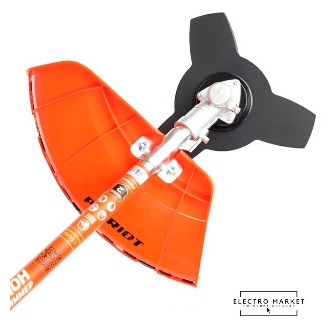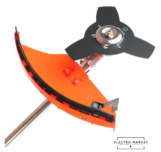 бензиновый, оснастка: леска+металлический нож+металлический диск, ширина скашивания 25.5-42 см, вес 9.2 кг
