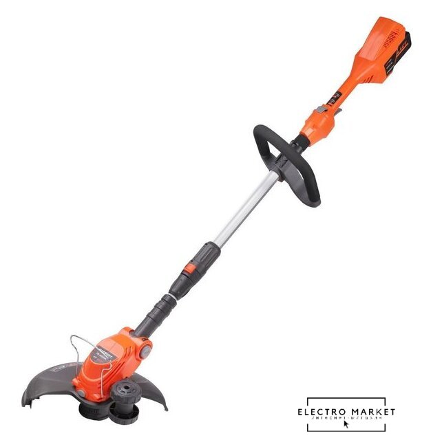 Комплектация | - Триммер;- Защитный кожух;- Защитная скоба;- Передняя рукоятка;- Опорный ролик с крепежом;- Аккумуляторная батарея;- Зарядное устройство;- Запасная леска;- Инструкция. |